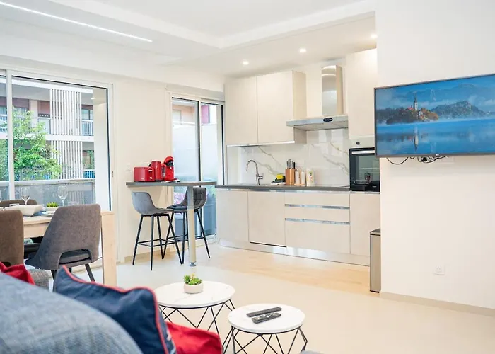 在Sublime 2P - 10 Min Near Beaches - Air Conditioning - Garage 昂蒂布,可以看见城市的景致,距离圣伯尔纳定小堂只有0.6公里。 住所是一家公寓,设有大厨房,配有所有必要的餐具。